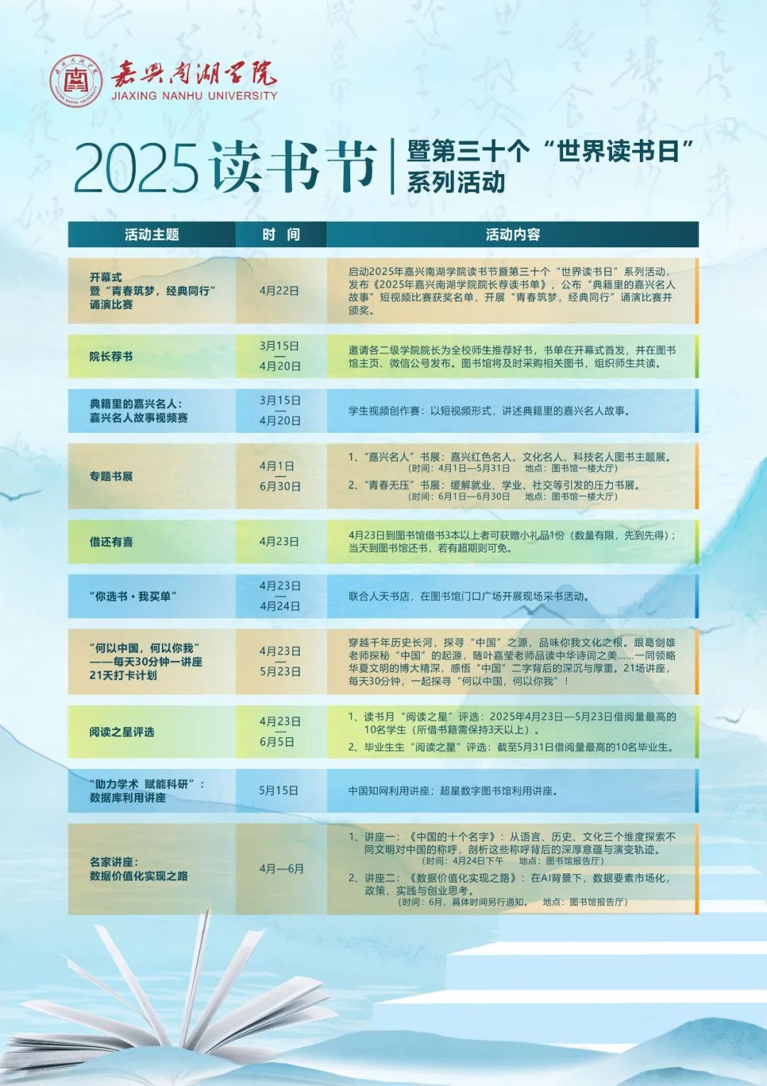 图书馆负责人围绕读书节主题“南湖书香、经典共读‌”,介绍了精心策划的阅读诵演比赛、嘉兴名人故事视频赛、专题书展、“每天30分钟一讲座,21天打卡计划”‌等系列活动 ,邀请全体师生走进图书馆,走近阅读,养成终身阅读习惯。师生代表500余人参加活动,活动现场的气氛热烈。