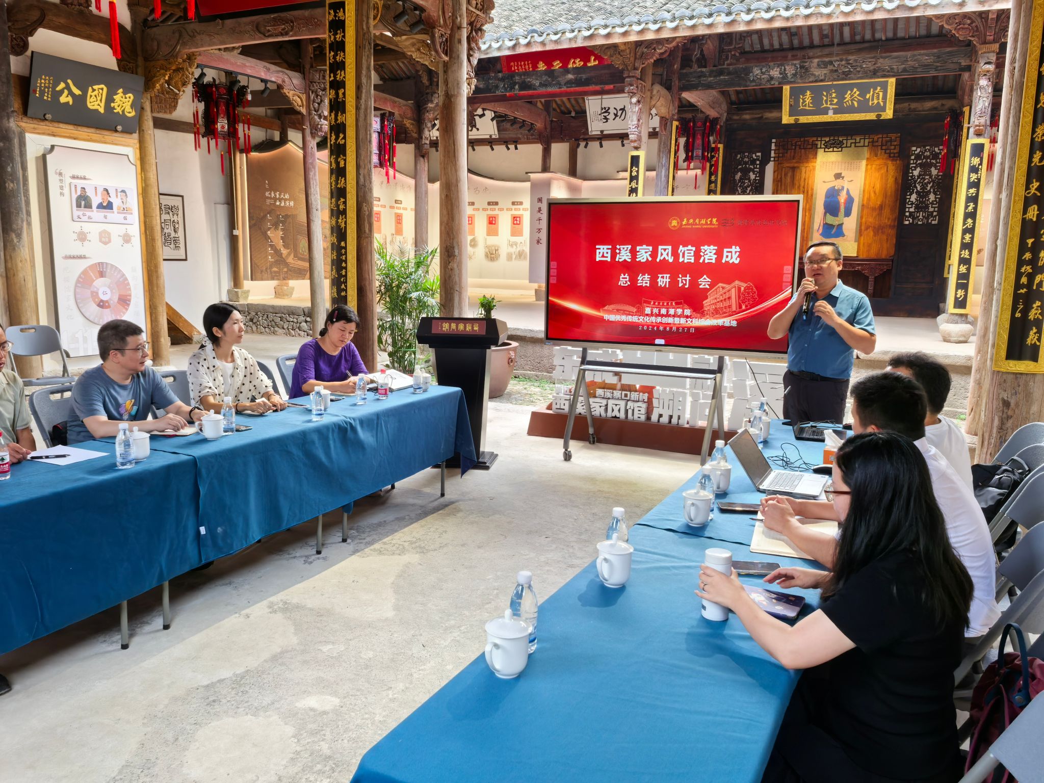 近日,西溪家风馆落成总结研讨会在金华市永康市西溪镇贾处村文韬公祠内举行。校长贾文胜、副校长赵渊、校督导办主任袁志明,西溪镇党委书记俞晓雅出席会议。会议由人文与艺术学院党委书记王晨主持。